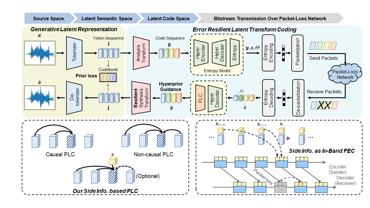 transmission over packet-loss networks, which performs two-stage coding and PLC in the generative latent space of a